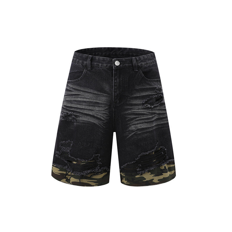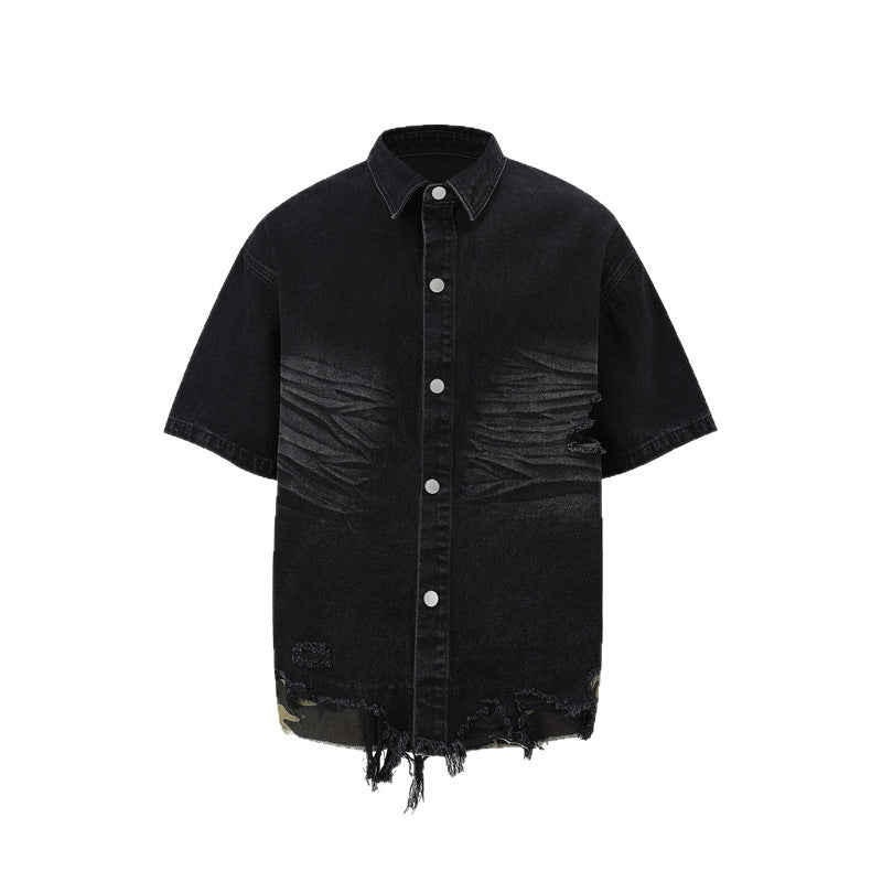 Cut Edge Stitching Leopard Print Denim Short Sleeve